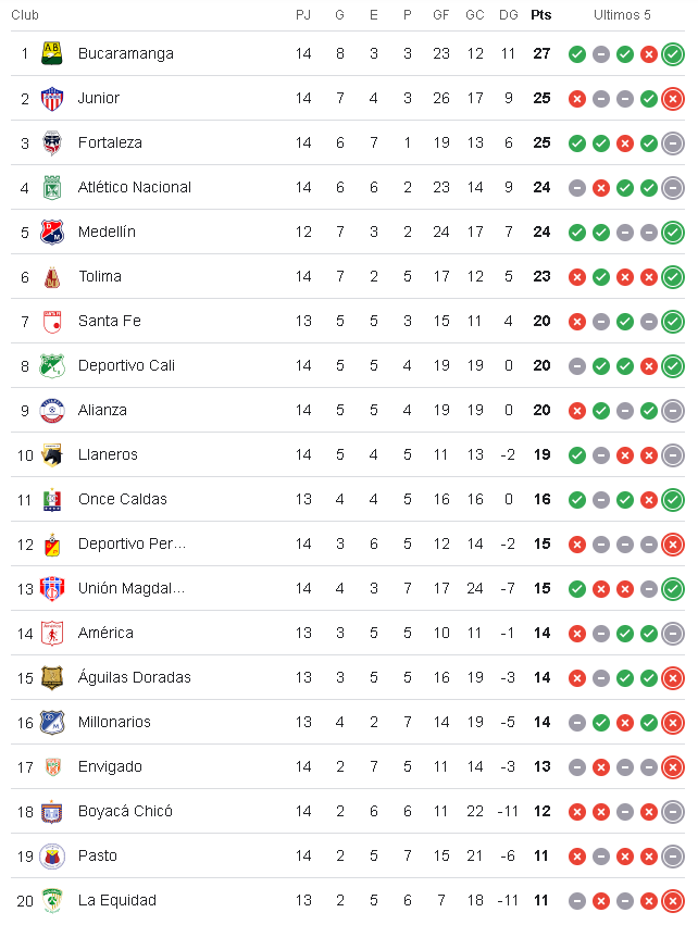 - Bucaramanga lidera con 27 puntos.