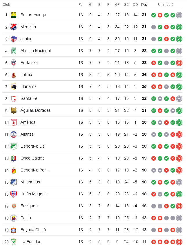 El torneo está al rojo vivo. Bucaramanga, Medellín y Junior comparten el liderato con 31 puntos, seguidos de Atlético Nacional y Fortaleza con 28.