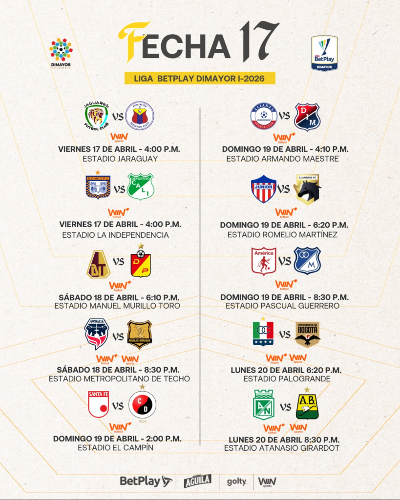 La Liga BetPlay entra en su recta final del todos contra todos y la jornada 17 promete emociones fuertes, partidos decisivos y equipos jugándose puntos clave en la lucha por la clasificación.